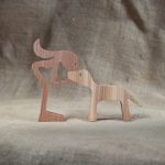 Ez a kutyás figura egy örömteli pillanatot örökít meg, amint egy női alak játszik kutyájával.